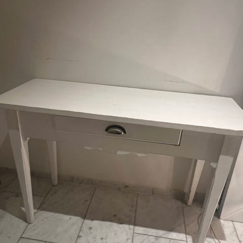 Selger et fint og praktisk skrivebord som kan kjøpes med eller uten påbygg. Det er godt brukt så har noen synlige bruksmerker. 1000 kr for bare skrivebordet, og 500 kr for overbygget i tillegg.