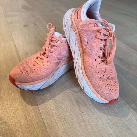 Hoka løpesko i størrelse 38 med blå og oransje farge. Skoene har en slitesterk yttersåle med godt grep. De er noe små i størrelsen!