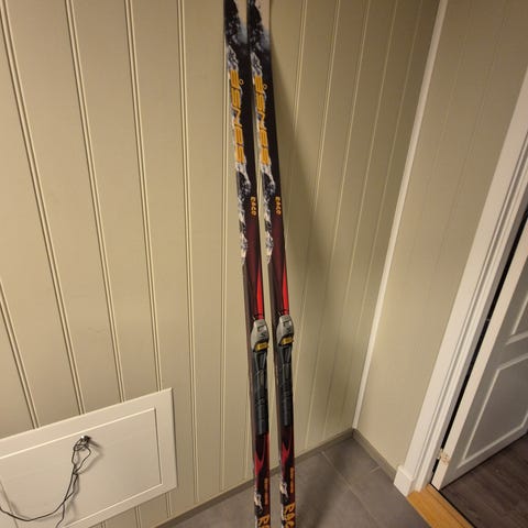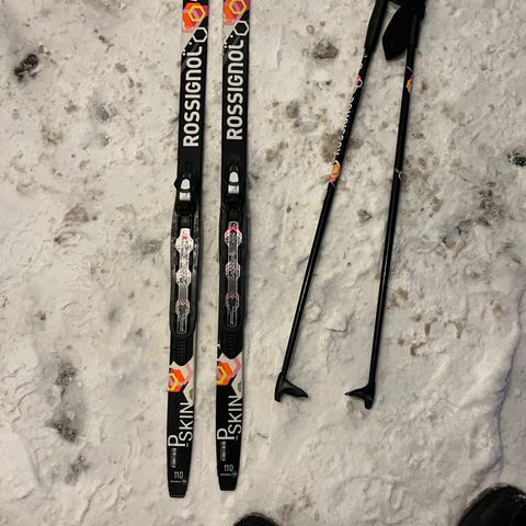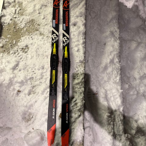 Rossignol R-Skin Speed langrennsski med lengde 110 cm. Skiene har integrert binding og fell som gir godt feste.