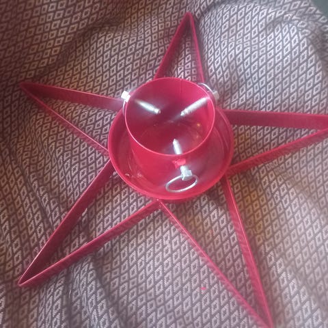 Rød juletrefot i metall, designet for å holde juletreet stabilt. Har justerbare skruer for å feste treet sikkert. Passer til mindre til mellomstore juletrær.