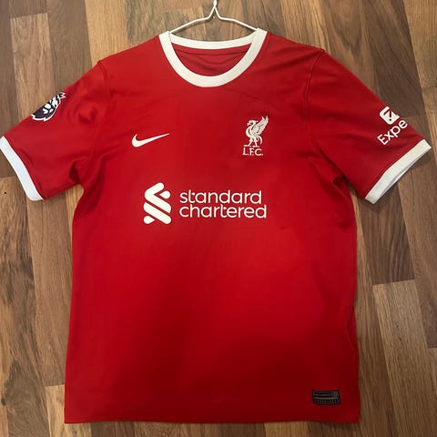Meget pent brukt orginal Liverpool hjemmedrakt fra 89/90 sesongen. Ingen bruksmerker eller slitasjer. Str 30-32 (passer til barn, ca 6-10 år).