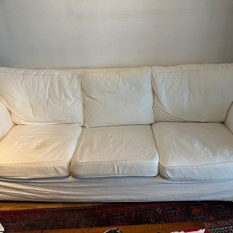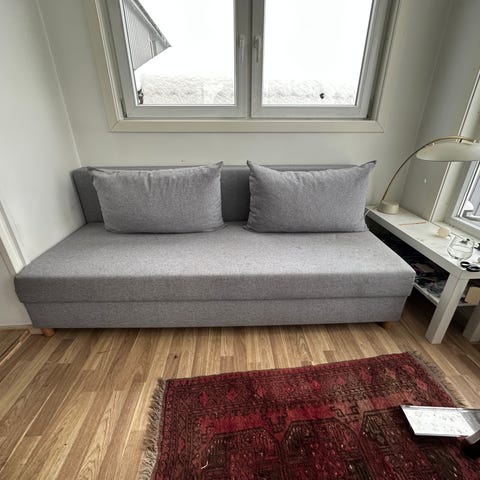 Med en vask blir det en fin sofa, sist renset i mai 2025. Ikke vasket nylig og bærer preg av det. Noe solskade på bakvegg mot vindu.