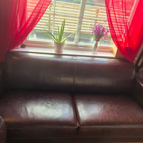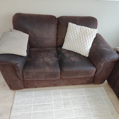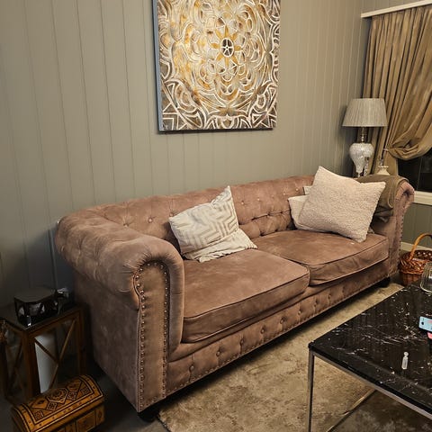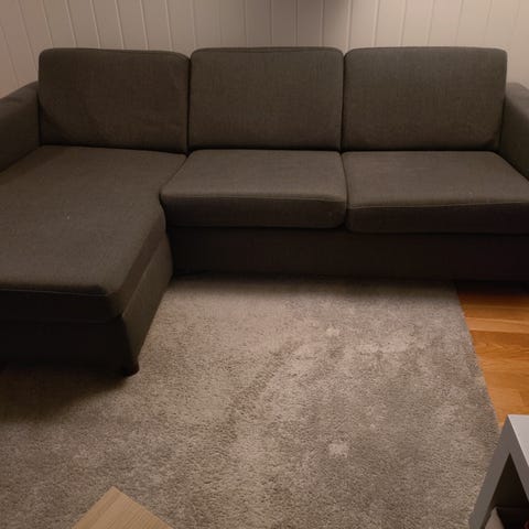 Pent brukt mørk blå treseter selges . Sofaen er i lin og har dunputer. Ble kjøpt i en interiørbutikk i Grimstad for noen år siden. (Ingen husdyr). Må hentes .