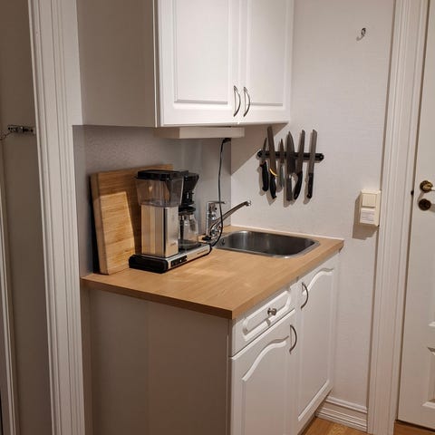 Kjøkkeninnredning i tre med hvite fronter og benkeplate
