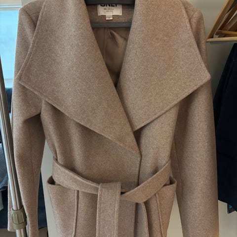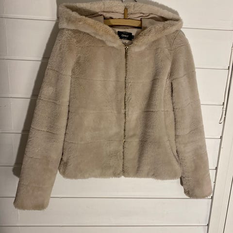 ONLY Jakke i beige farge, laget av fuskepelsmateriale. Jakken er i størrelse S og er designet for kvinner, to lommer foran.