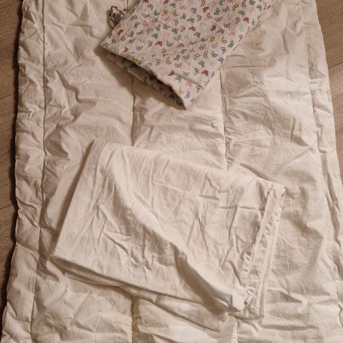 Pent brukt sengetøy til baby To sett med dynetrekk og putetrekk, to dynetrekk og et laken.