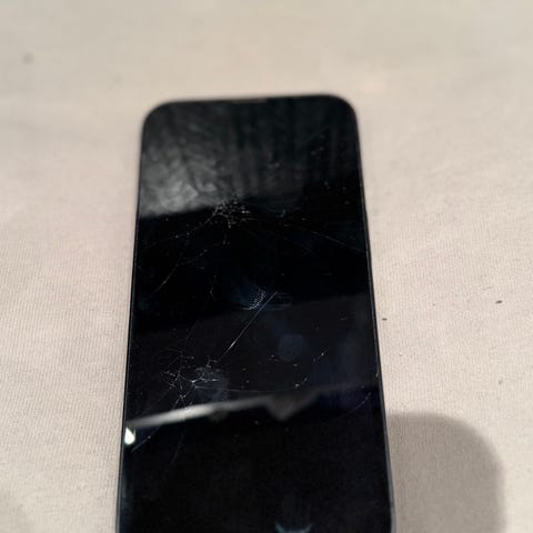 Apple iPhone 13 med 128 GB lagringskapasitet. Telefonen har en "rose gold" farge. Batterikapasiteten er 78 % ifølge systeminformasjonen. Enheten viser noen tynne riper og sprekker på baksiden.