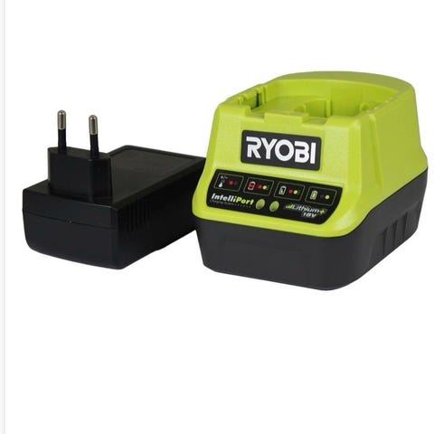 Ryobi batterilader for lading av 18V batterier. Laderen har LED-indikatorer som viser ladestatus og tilkobling. Enheten er kompakt og enkel å frakte.