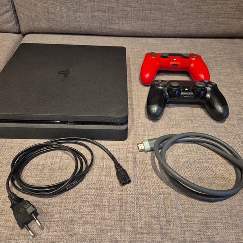 Sony Playstation 4 spillkonsoll med en rød trådløs kontroller og tilkoblingskabel. Konsollen har standard porter for tilkobling av tilbehør og nettverk. Passer for bruk med Playstation 4-spill. Spill er lagt til