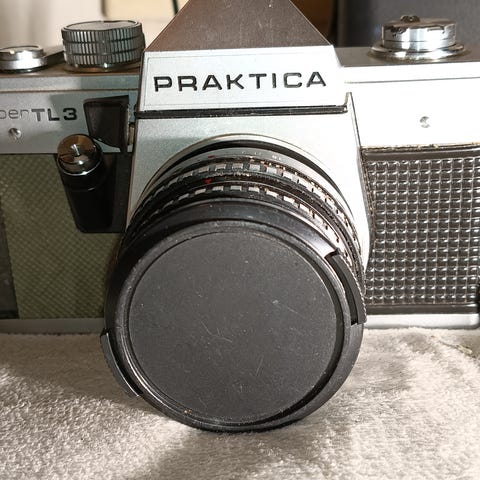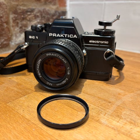 Her har du en analog retropakke, Praktica LTL kamerahus fra ca 1974. Objektiv Pentagon 1.8/50 med VIVITAR 49 mm SKYLIGHT (1A) filter