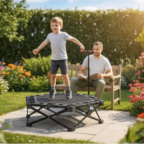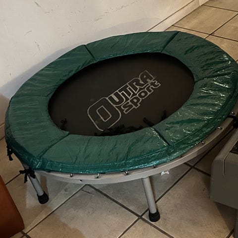 Selger treningstrampoline fra Sport Supply, diameter 103 cm. Trampolinen står på 6 metallrør (høyde 23 cm) med gummiknotter under. 1 av gummiknottene har en liten sprekk i overkant. Selger derfor som "pent brukt, i god stand" selv om trampolinen aldri har vært brukt. Det vesentlige – fjærer og kantpolstring – har verken skader eller slitasje. Kan ikke sendes "Fiks ferdig" pga. størrelse/form, men jeg kan levere i Oslo for 100 kr ekstra.