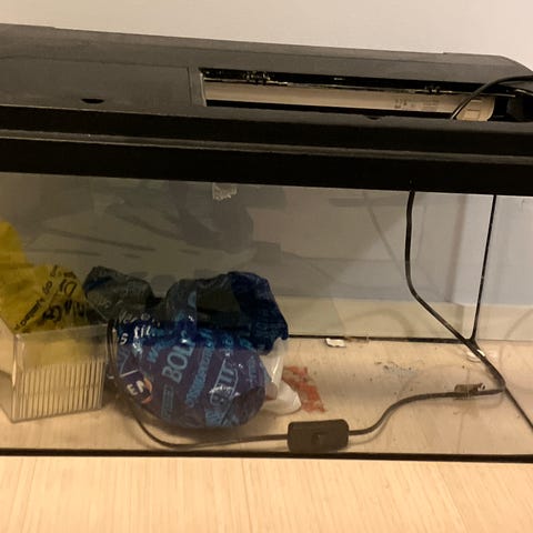 Akvarium med tilbehør, inkludert varmeelement, og fiskenett. Volum på ca. 60 liter. Egnet for akvariefisk og som et lite vannmiljø for hobbybruk.