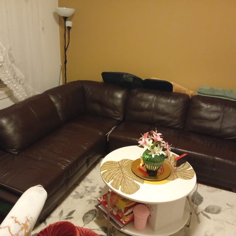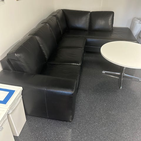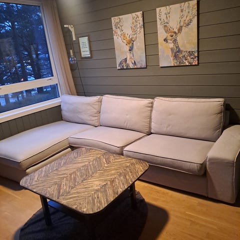 Godt brukt sofa med sjeselong. Noen flekker, mye støv/rusk under sofaputene(de man sitter på) som er vanskelig å støvsuge vekk, sees ikke.