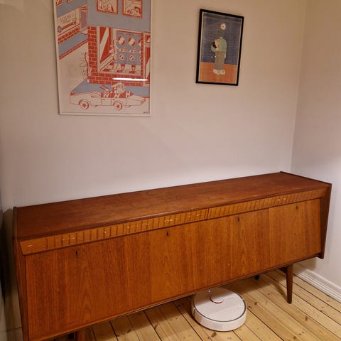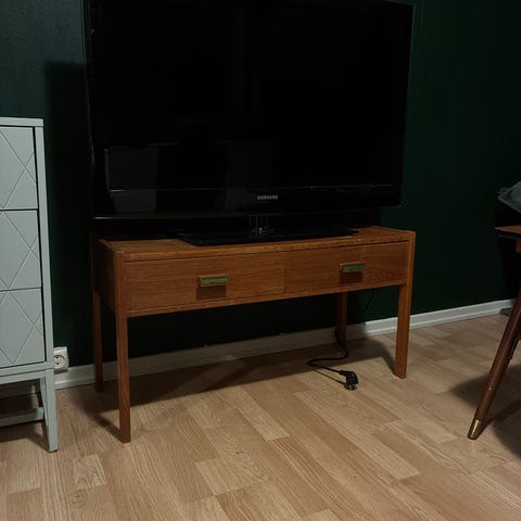 TV-møbel i tre med to høye hyller. Møbelet har flere åpne hyller for oppbevaring og plass til TV i midten. Fargen er trebrun, og materialet ser ut til å være tre eller treimitasjon. Passer til oppbevaring av elektronikk, bøker eller dekorative gjenstander. Møbel fra Bohus.