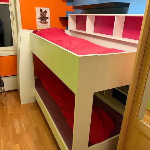 Skeidar køyeseng for barn i hvit farge. Sengen har integrert trapp med oppbevaringsplass, samt skap under sengen for ekstra lagringsmuligheter. Praktisk innfellbart skrivebord og spennende lekerom under sengen. Passer for barnerom og gir funksjonell plassutnyttelse. Pent og lite brukt, men det er noen klistremerker på sengegjerdet (se bildet).
