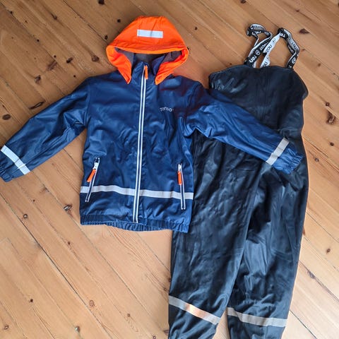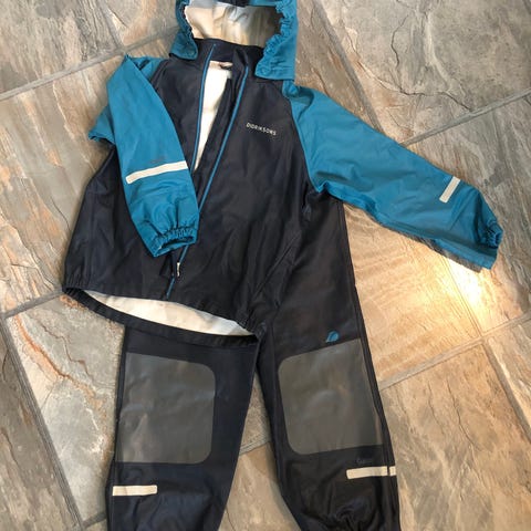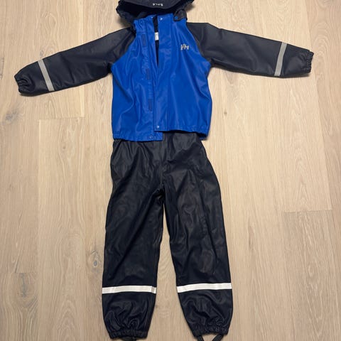 Didriksons regnsett for gutt i størrelse 120, farge blå. Settet inkluderer jakke og bukse med elastiske fotstropper, laget for å gi beskyttelse og komfort ved utendørs bruk.