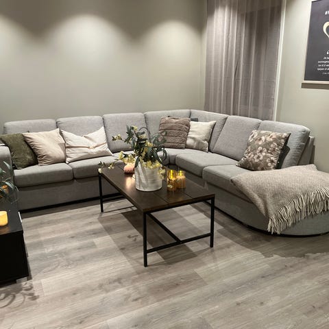 En veldig pent brukt hjørnesofa i lysegrå farge.