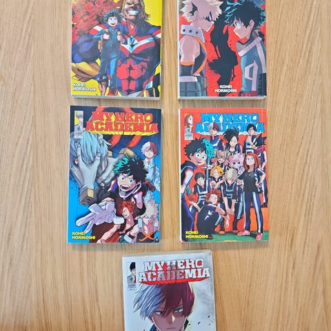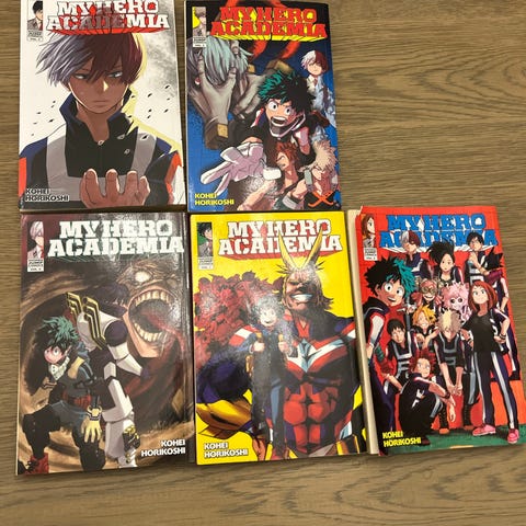 Selger My Hero Academia manga, volum 1–3, på engelsk.