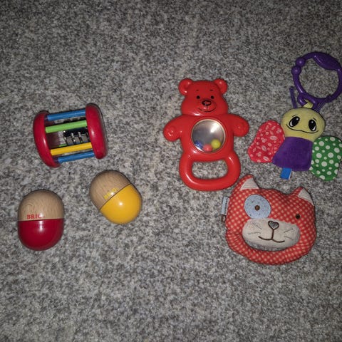 L95. Fine baby rangler som rasler og lager lyd. Alle er fine å holde i og i mykt stoff, noen også med speil. Fritt valg for 25kr per stykk.