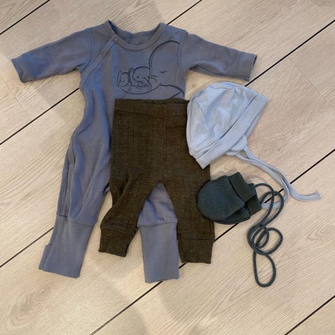 Jeg skal selge en klespakke med fyre genser og tre bukser i størrelse 62.