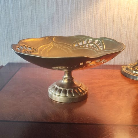 Elegant håndlaget skål i messing med hamret overflate og dekorativ fot. Skålen har et tidløst og eksklusivt uttrykk og fungerer perfekt som interiørdetalj på spisebord, skjenk eller stuebord.