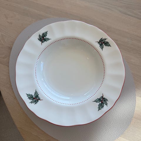 Salt & pepperbøsse i porselen fra Holly designet av Linda Maier i original emballasje. Bøssene har en konisk form med rød kant øverst og røde prikker nederst, mens motivet viser en nissekone og nissefar med kristtonblader. Holly made in Thailand home pottery. Høyde 5 cm, diameter 4,5 cm. Esken har mål: 10x6,5x5 cm. Vekt:137g. Passer til bruk ved middagsbordet i julen. Beklager at noen av bildene er litt utydelige. Hele og pene. Selges kr. 150.- Hentes Jevnaker eller sendes. Ved sending tilkommer frakt med sporing kr. 70.- med Postnord. Pakker godt. Har vipps.