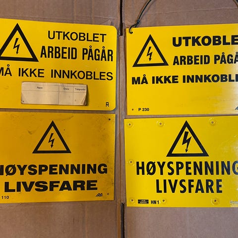 Emaljeskilt med tekst 'Høyspenning Livsfare'.