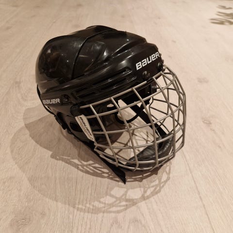 Bauer ishockeyhjelm med bur, designet for ishockey. Hjelmen er hvit med røde og blå detaljer, og har justerbare stropper for passform og sikkerhet.