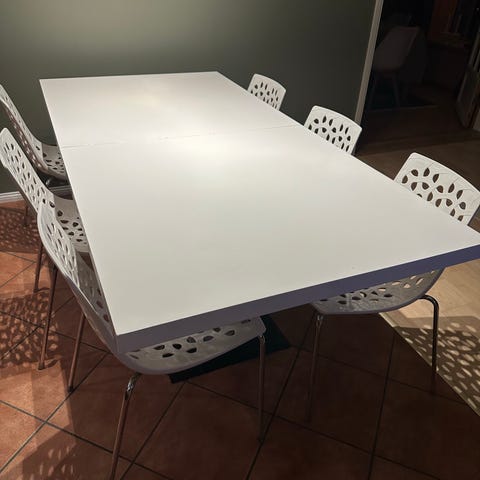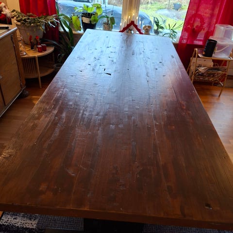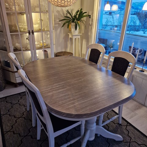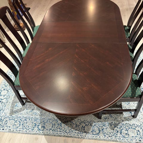 Bordet er i god stand, medfølger 2 stk ileggsplater på 40cm hver, så bordet kan totalt bli 240. Plass til ileggsplatene under bordplate.
