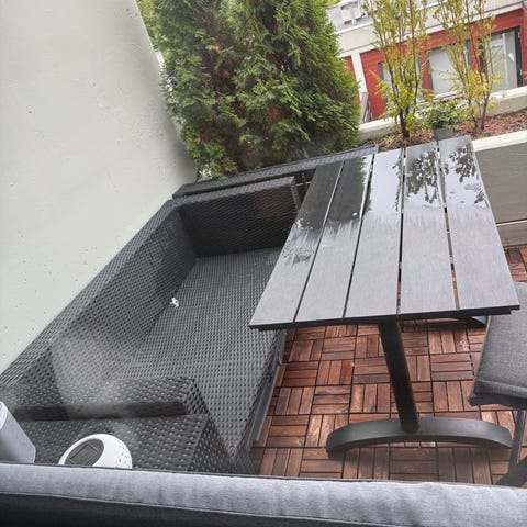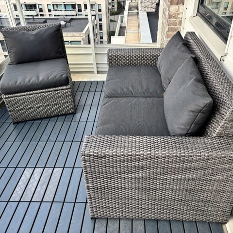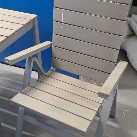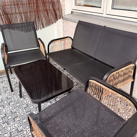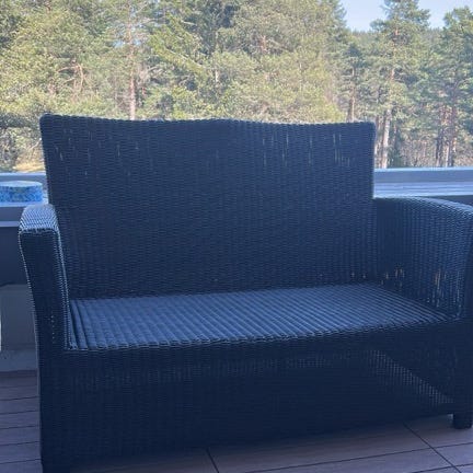 1 sofa, bord og 2 stoler (selv om det bare er én stol avbildet på bildet), med tilhørende puter.