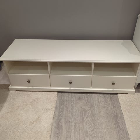 Veldig praktisk med hyller og skuffer under, og den har en plate bak, slik at ledninger ikke synes forfra.