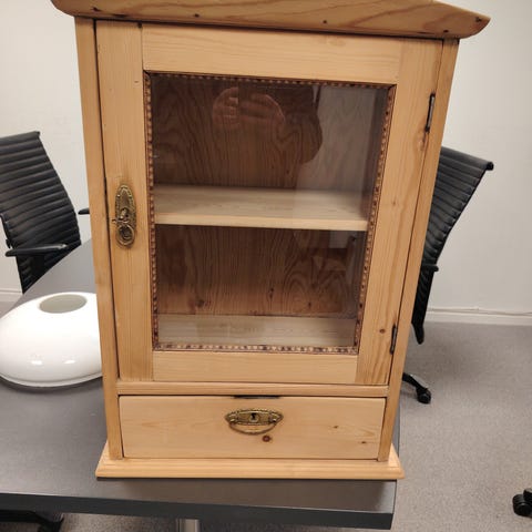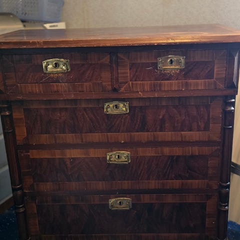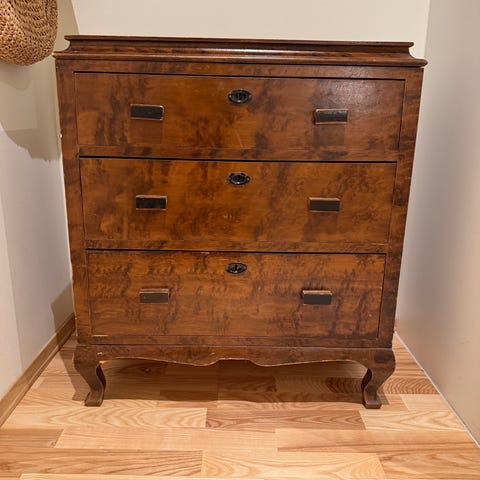 Eldre kommode, trolig i flammebjørk. Usikker på alder, men bildeanalyse tror den er antikk fra 1800 tallet. Den har en del slitasjer, spesielt på topplaten og inni skuffene. Mulig den kan få skinne igjen med litt kjærlighet, for eksempel ved å dekke toppen med kontaktplast. Noen av skuffene er litt tunge å åpne og lukke, mulig dette kan fikses med å vokse sidene mellom skuffene og kommoden. Selges som den er