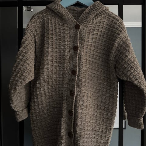 Strikket hettejakke i 100% myk babyull. Hjemmelaget, fått i gave.