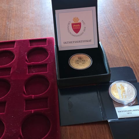 Grunnlovens jubileumsmedalje Norge 1814-2014 med diameter på 99 mm. Medaljen er laget i metall med fargeelementer og har motiv på begge sider, inkludert portretter av Christian Frederik og Carl Johan, samt en historisk scene fra grunnlovsforhandlingene. Medaljen leveres med et ektehetssertifikat som beskriver motivene og kvaliteten på medaljen.