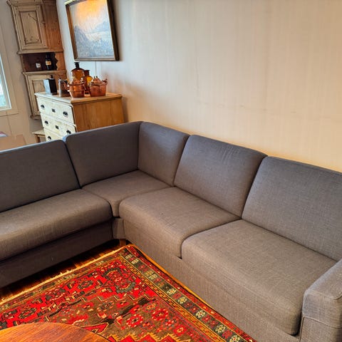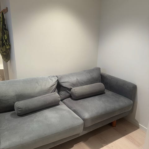 Grå sofa gis bort. God å sitte i. Noen merker som går bort ved vask.