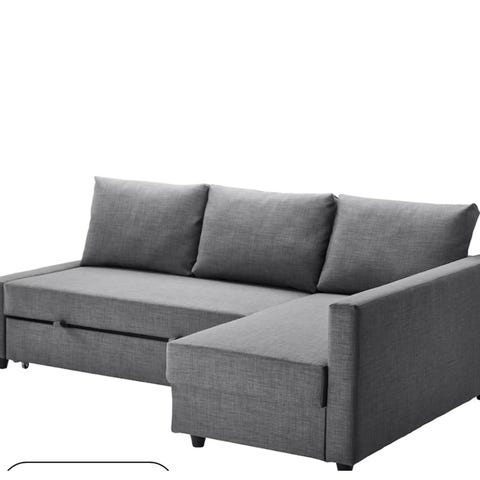 IKEA Friheten sovesofa i grått stoff. Sofaen har chaiselong med oppbevaringsplass under, og kan enkelt omgjøres til seng. Passer for oppbevaring og som ekstra soveplass i stue eller gjesterom.
