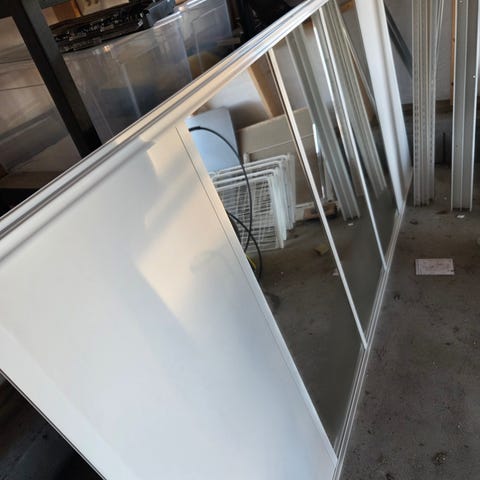 Elfa skyvedørsgarderobe: 2 hvite dører og en speildør m Elfainnmat