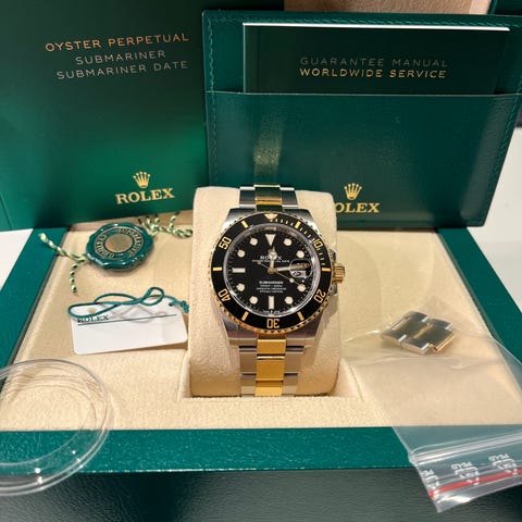 Rolex Submariner Date “Bluesy” i Oystersteel og 18k gult gull – en tidløs ikonmodell med blå sunburst-skive og keramisk Cerachrom-bezel. Klokken representerer det ypperste av Rolex’ kombinasjon av luksus, presisjon og sportslig eleganse, og er blant de mest ettertraktede variantene i Submariner-kolleksjonen.