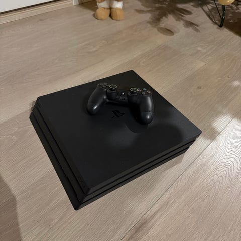 Playstation 4 Pro spillkonsoll i svart farge. Inkluderer to svarte kontrollere og nødvendig kabling for tilkobling.
