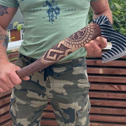 Denne håndlagde øksen har et utskåret askeskaft med detaljert gravering av beskyttende runer – Vegvisir og Othala – som gir både historisk dybde og estetisk verdi til denne skandinaviske øksen.