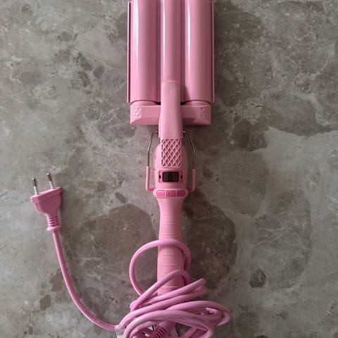 Mermade Hair Pro Wave Pink hårkrølltang i rosa farge. Verktøyet har tre parallelle tenger for å lage bølger i håret. Egnet for styling av hår med fokus på å skape store bølger.
