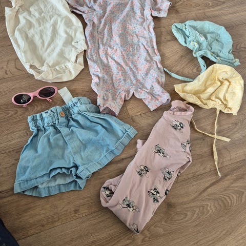 Alt brukt lite av 1 barn, ingen flekker men vil ikke fremkomme som nytt, utenom cardiganen som ser splitter ny ut. Badedrakten brukt kun 1 gang.