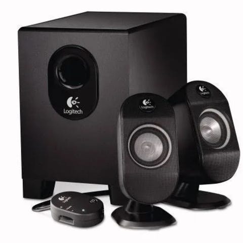Logitech G Series høyttalersystem med to satellitthøyttalere og en subwoofer. Enhetene har et svart design og innebygde LED-lys. Systemet er egnet for bruk med datamaskiner og spilloppsett.