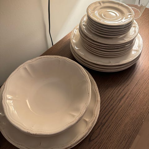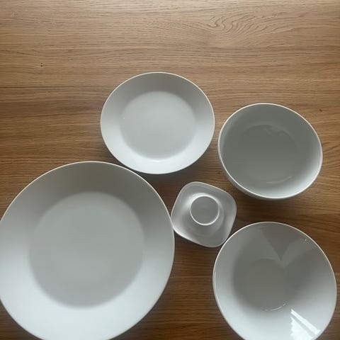 IKEA servise sett i hvit farge. Inkluderer tallerkener og skåler i forskjellige størrelser. Egnet for daglig bruk i kjøkken og spisestue.