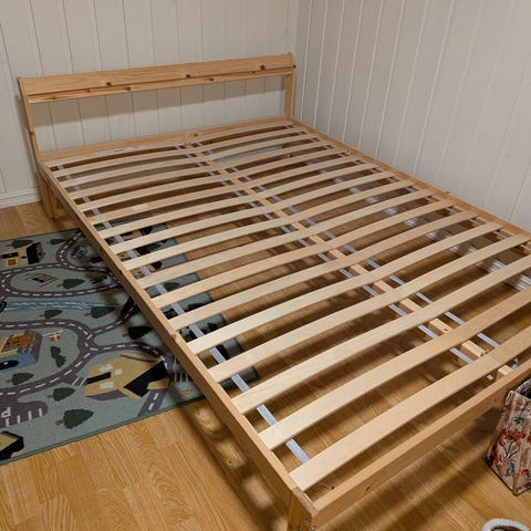 IKEA seng ramme i hvitt metall med dekorative detaljer. Passer for standard dobbeltseng-madrass. Egnet for bruk i soverom. 140 bred . 2 meter lang . Gis bort uten madrass . Gis bort mot demontering og utbæring ! Bor i 1 etasje :)