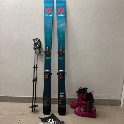 Superfin randopakke til dame. Ski Völkl Kiku (139-107-123) i lengde 178 cm. Dynafit binding, feller og Dynafit Mercury W sko følger med. Skoene er lette og komfortable på opptur og gjøres om til rå kjøresko når plast tungen settes på og skituppene pekes nedover.
