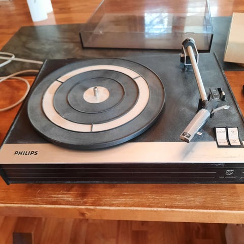 Philips platespiller med integrert høyttaler og beskyttende lokk. Enheten har en kompakt design som gjør den enkel å plassere i ulike rom eller ta med seg.