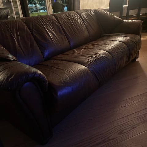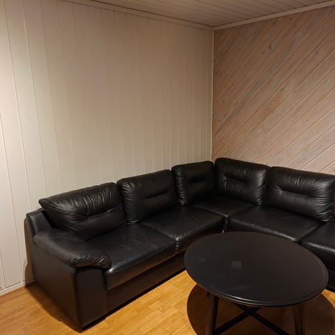 Lys hjørnesofa i ekte skinn. Godt brukt med noe slitasje. Fortsatt mye sofa igjen. Har vært behandlet regelmessig. Hentes i Børsa.