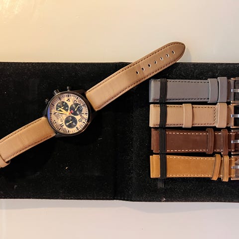 Kommer med 2 stk reimer, en skinnreim og en natoreim