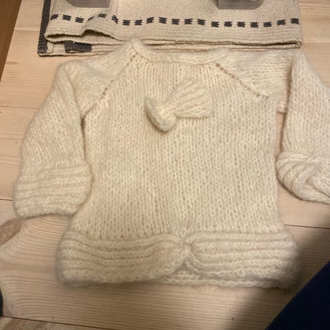 Fargen kommer ikke godt frem på bilde, men det er strikket i babyrosa/gammelrosa ull. Fin til både hverdags og fest. Passer barn fra 6-12 mnd.